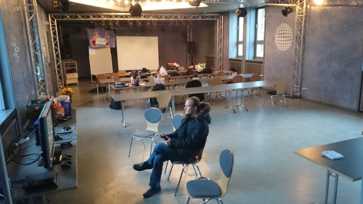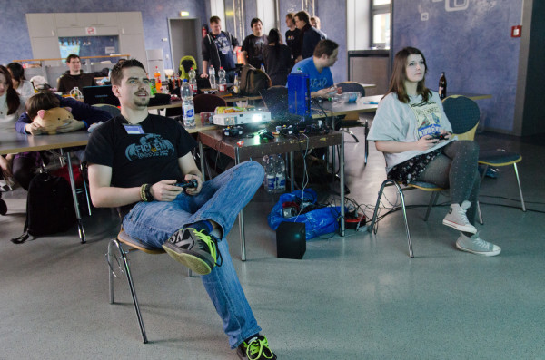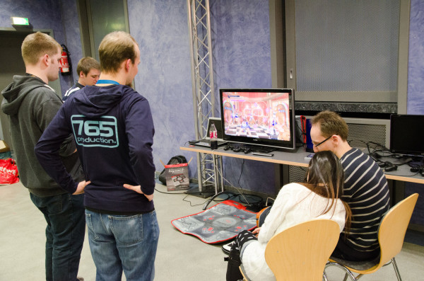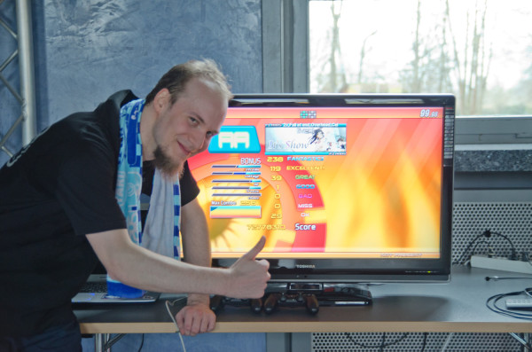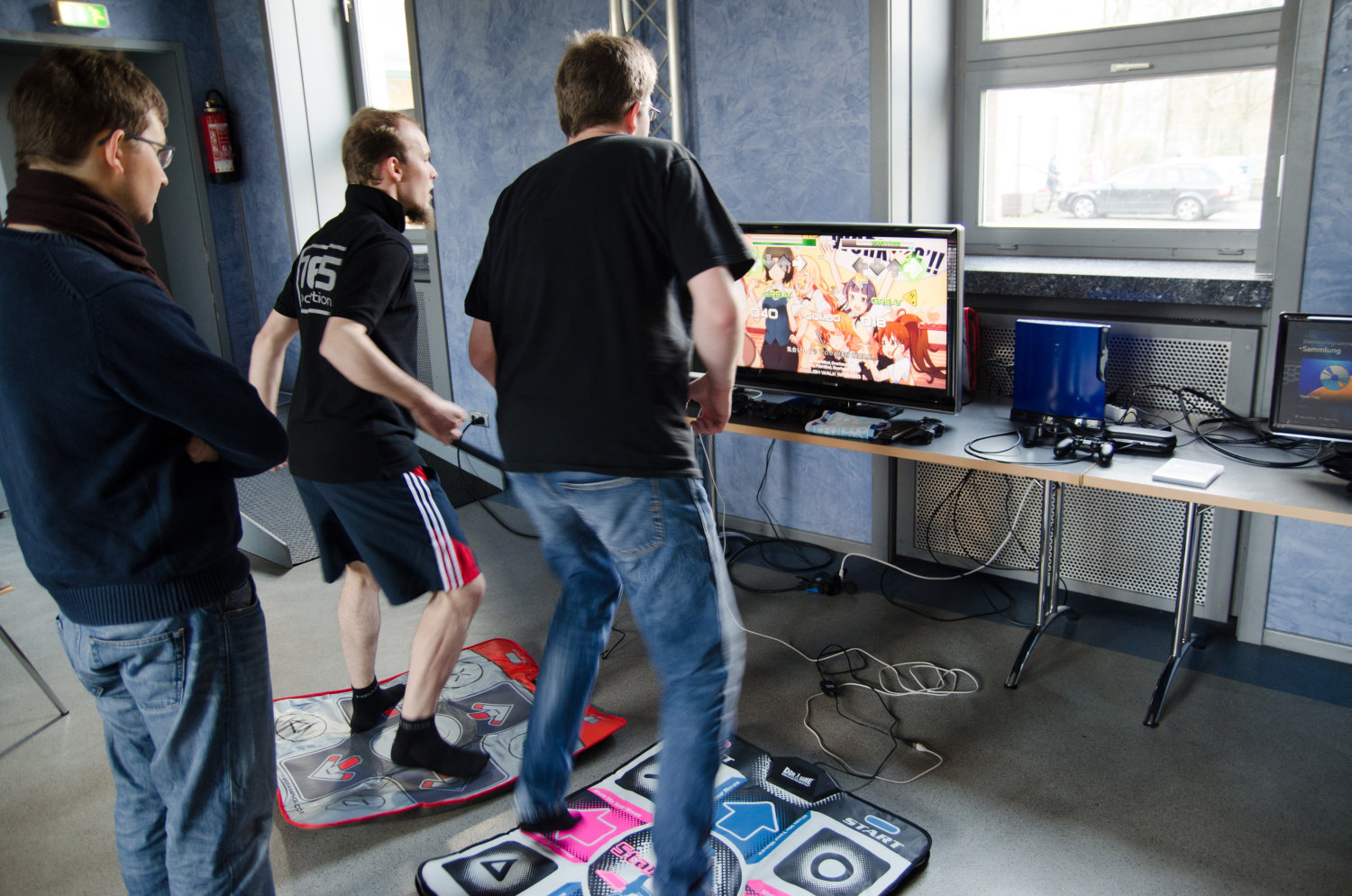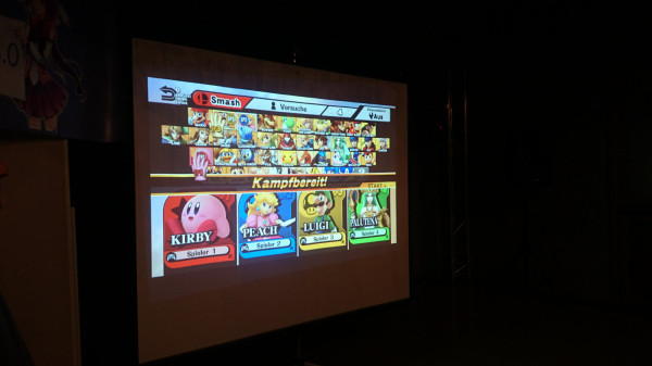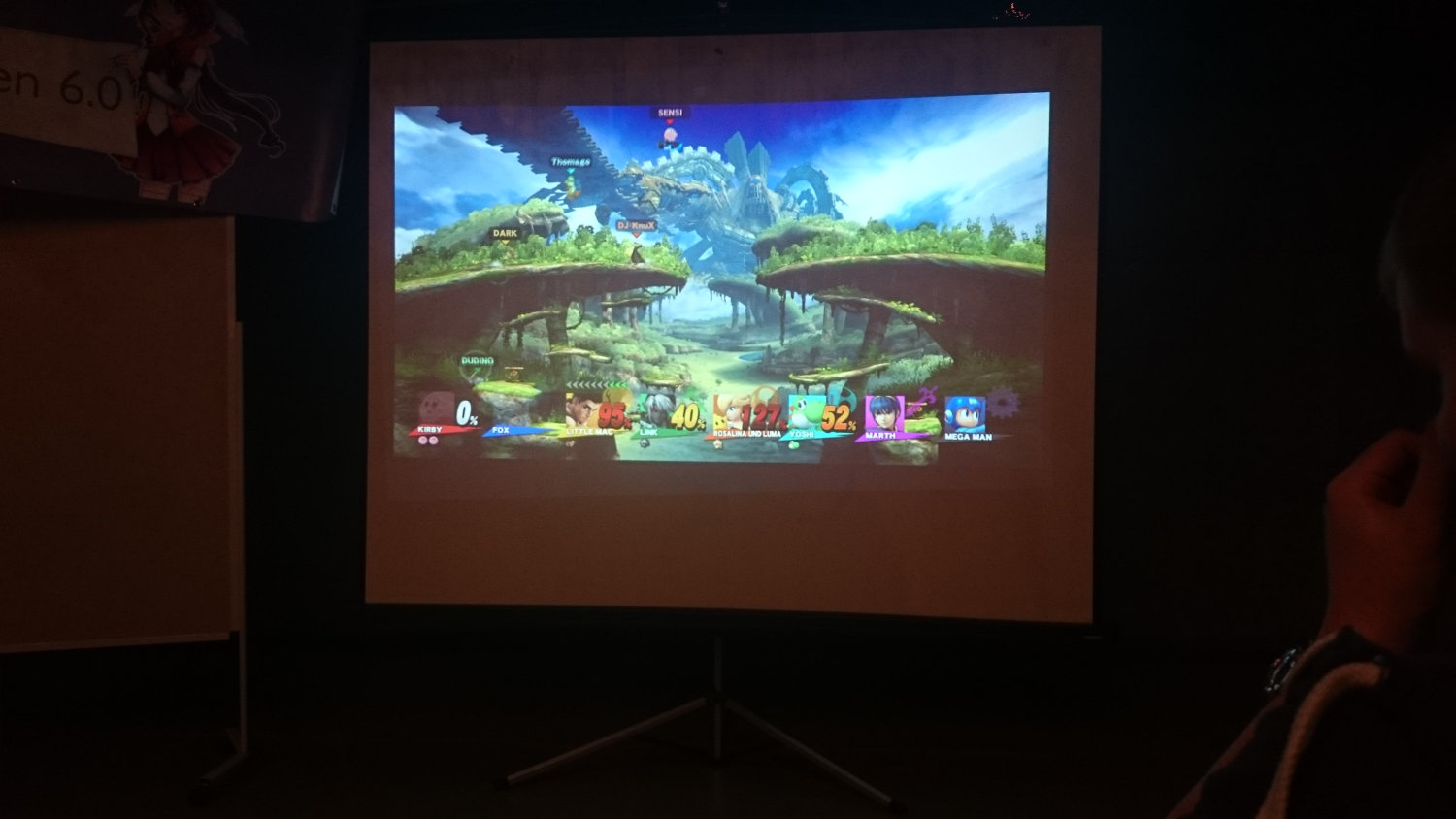 DSC_4479Und viel unterhalten wurde sich auch während des Spielens, selbst wenn man beim 8 Spieler Smash Bros. U schon beschäftigt genug damit war sich selbst auf dem Beamer zu finden. Idol Games, Beat’em’Ups, Step Mania usw. Irgendwas flimmerte die allermeiste Zeit über eine der Mattscheiben. Nur GalGun wollte dieses mal einfach keiner Spielen. Dafür gab es Akibas Trip 2.