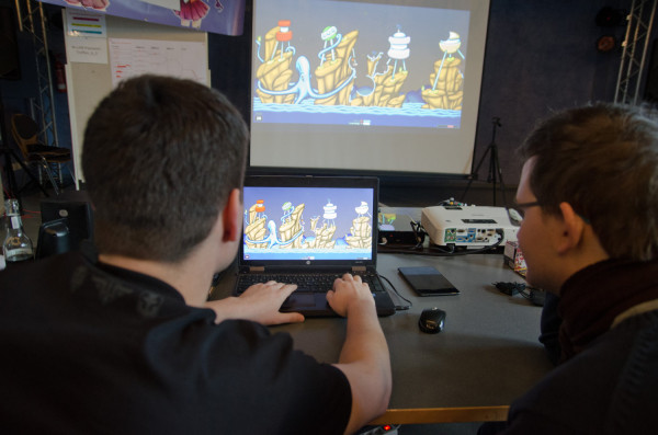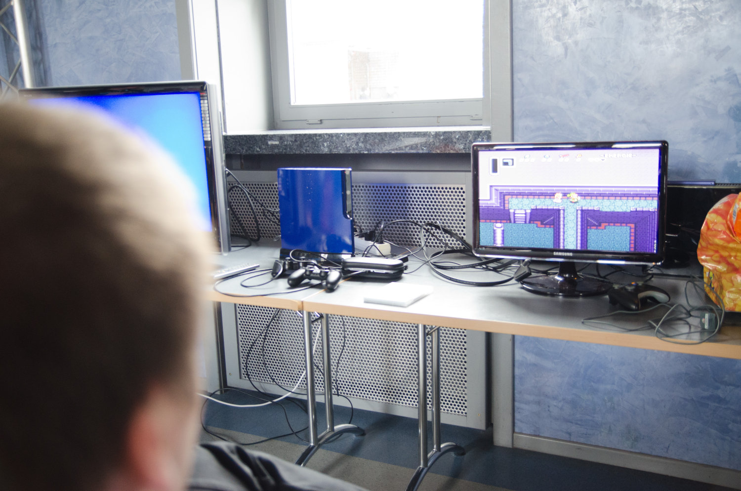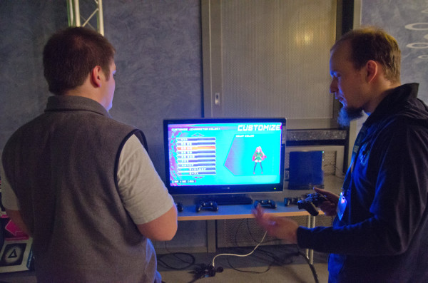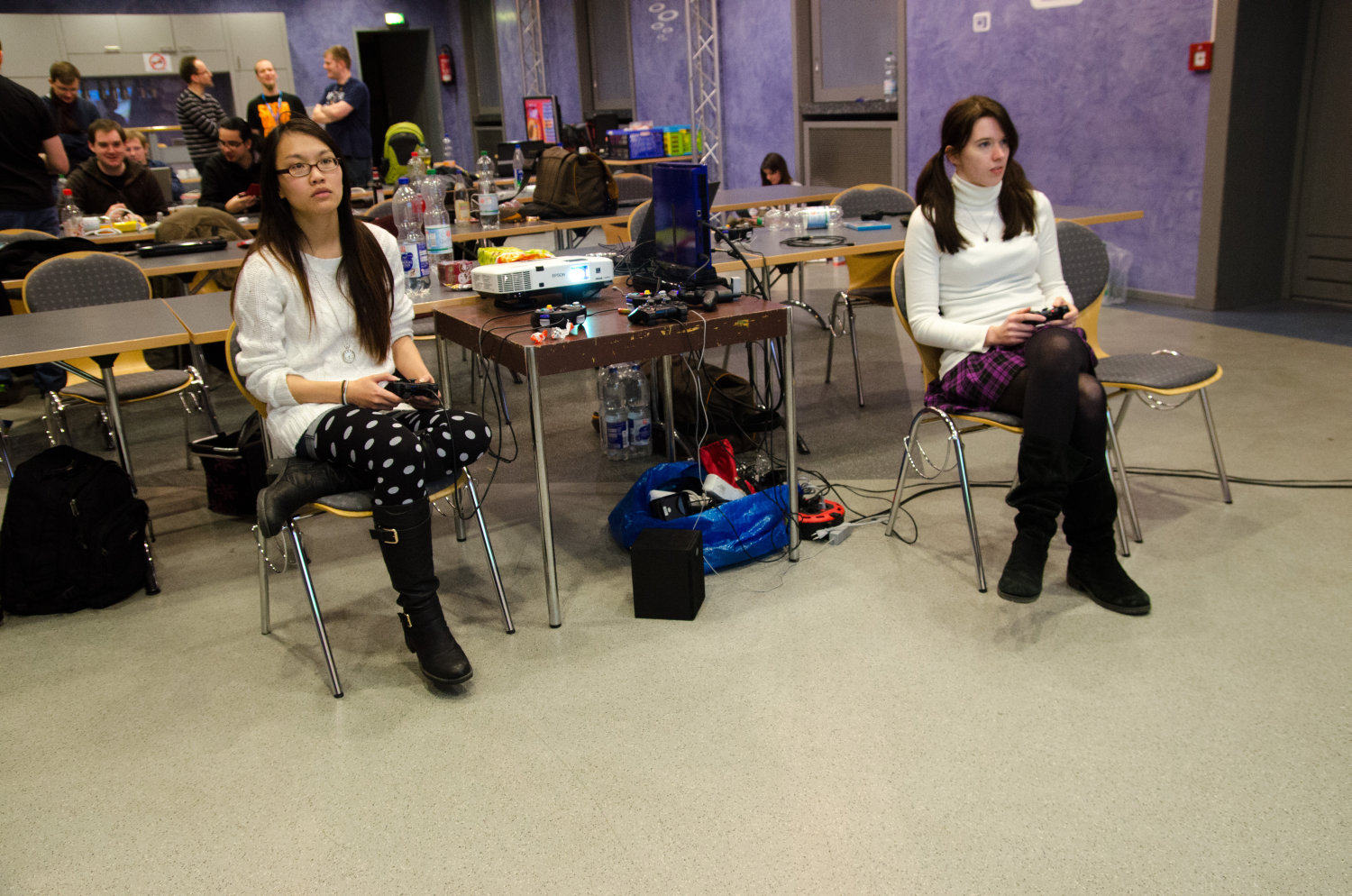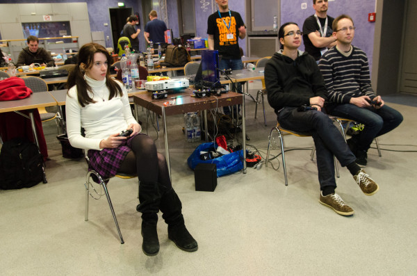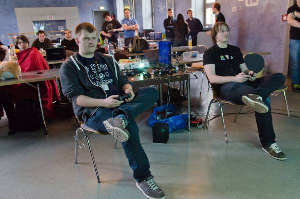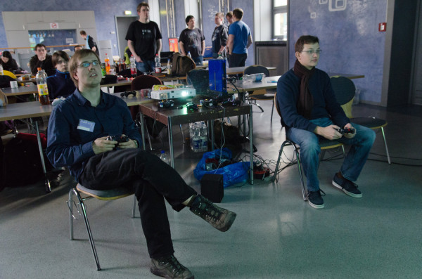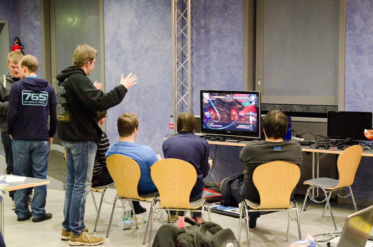 DSC_4479Und viel unterhalten wurde sich auch während des Spielens, selbst wenn man beim 8 Spieler Smash Bros. U schon beschäftigt genug damit war sich selbst auf dem Beamer zu finden. Idol Games, Beat’em’Ups, Step Mania usw. Irgendwas flimmerte die allermeiste Zeit über eine der Mattscheiben. Nur GalGun wollte dieses mal einfach keiner Spielen. Dafür gab es Akibas Trip 2.